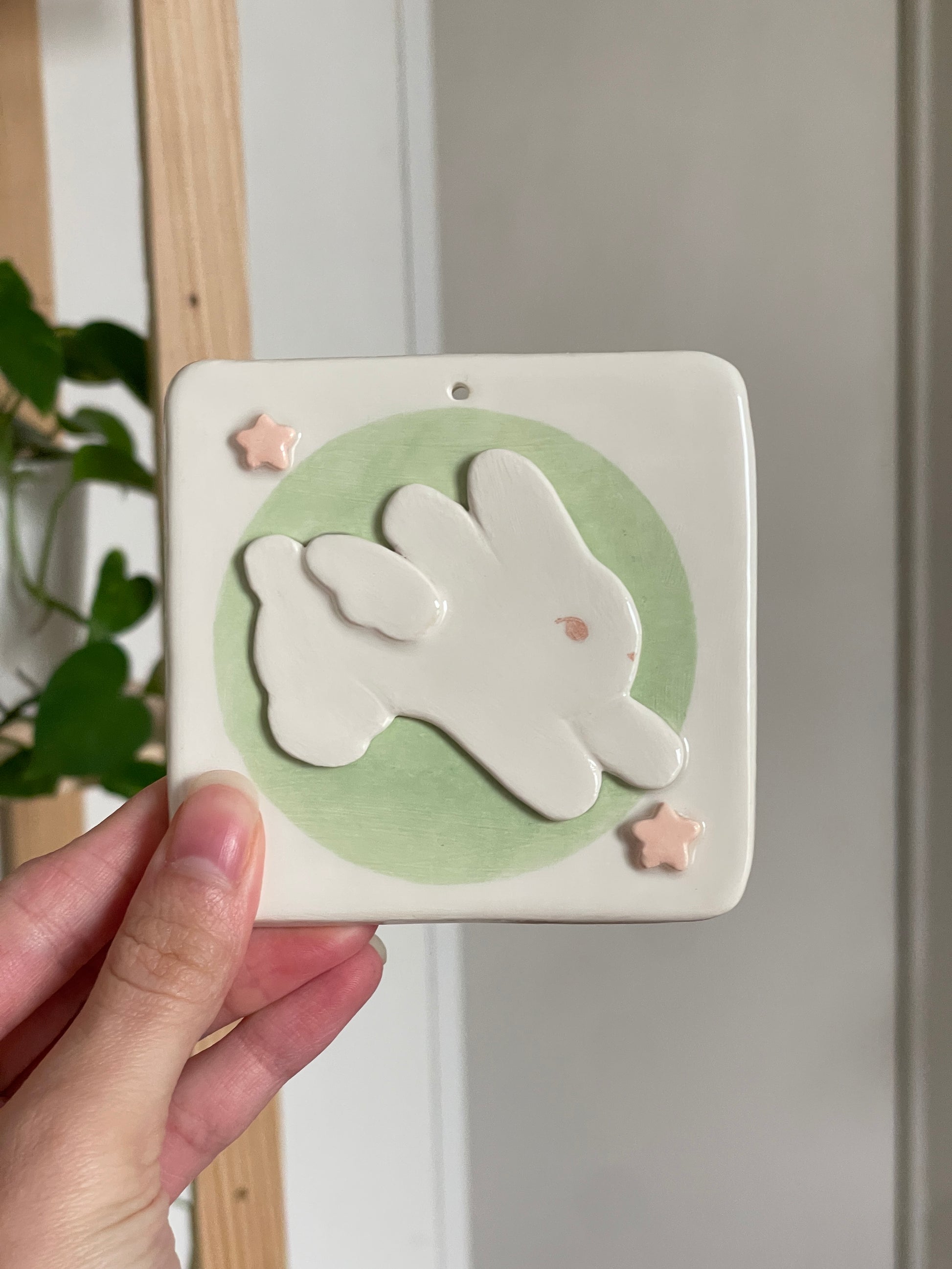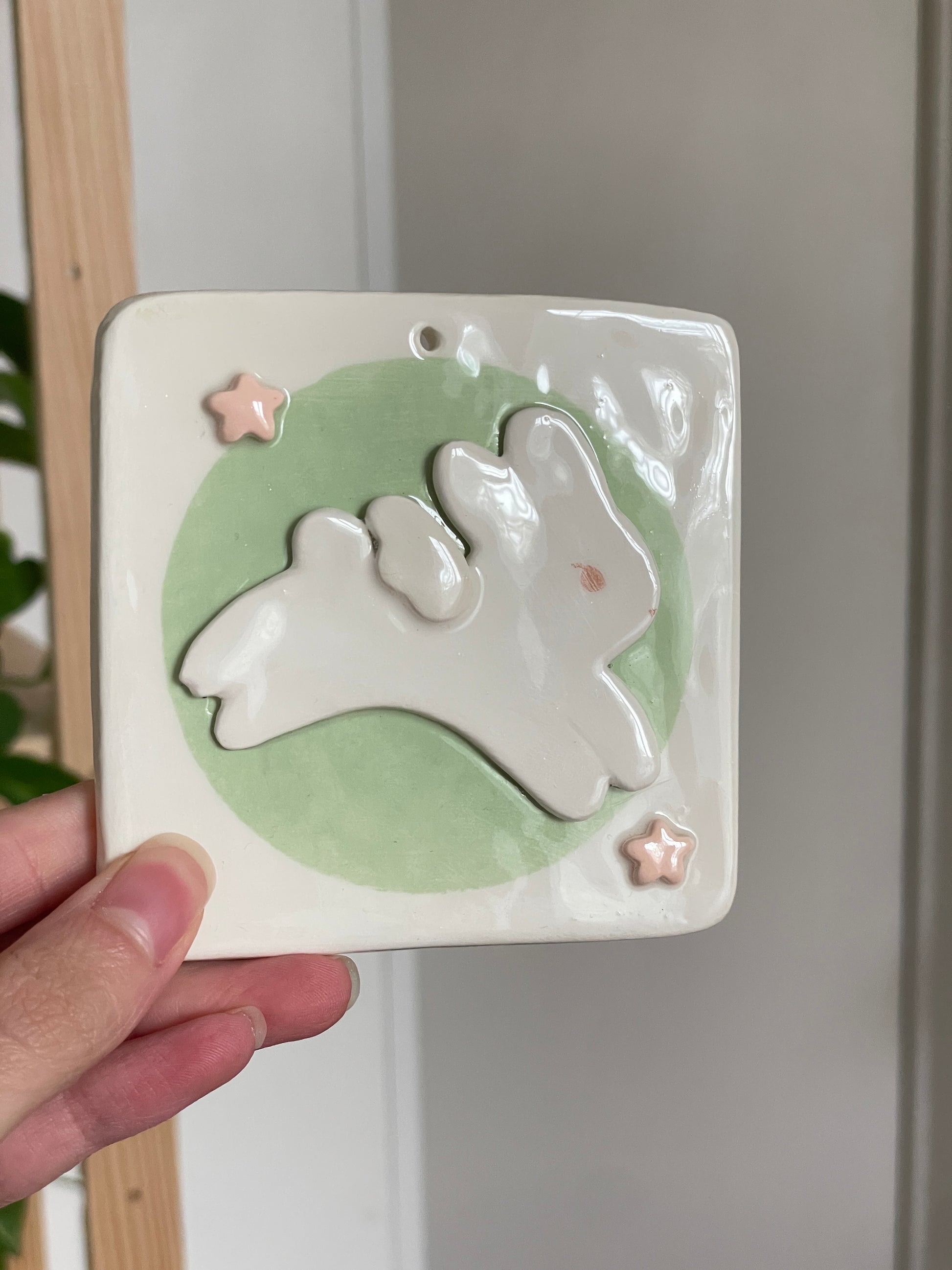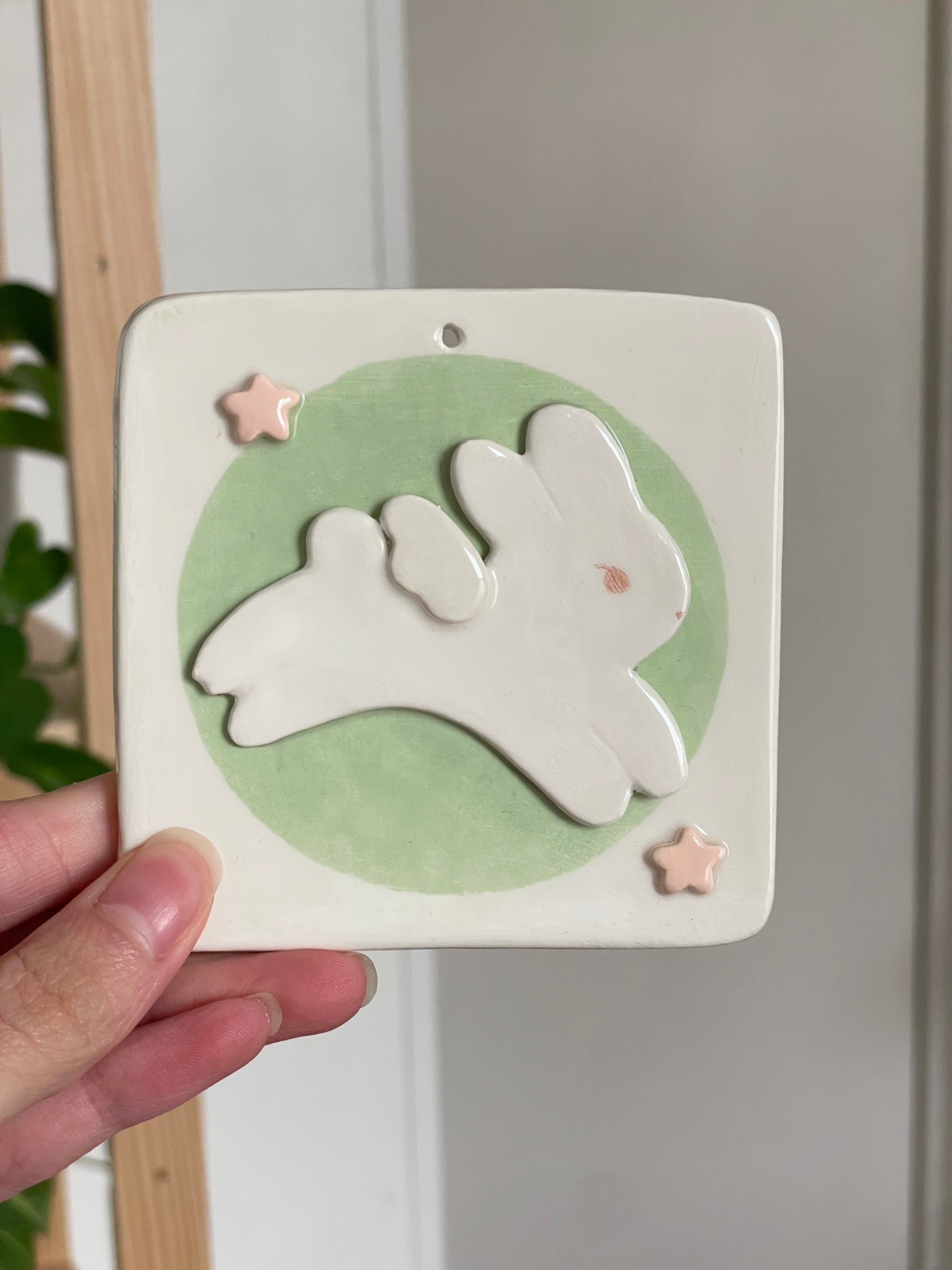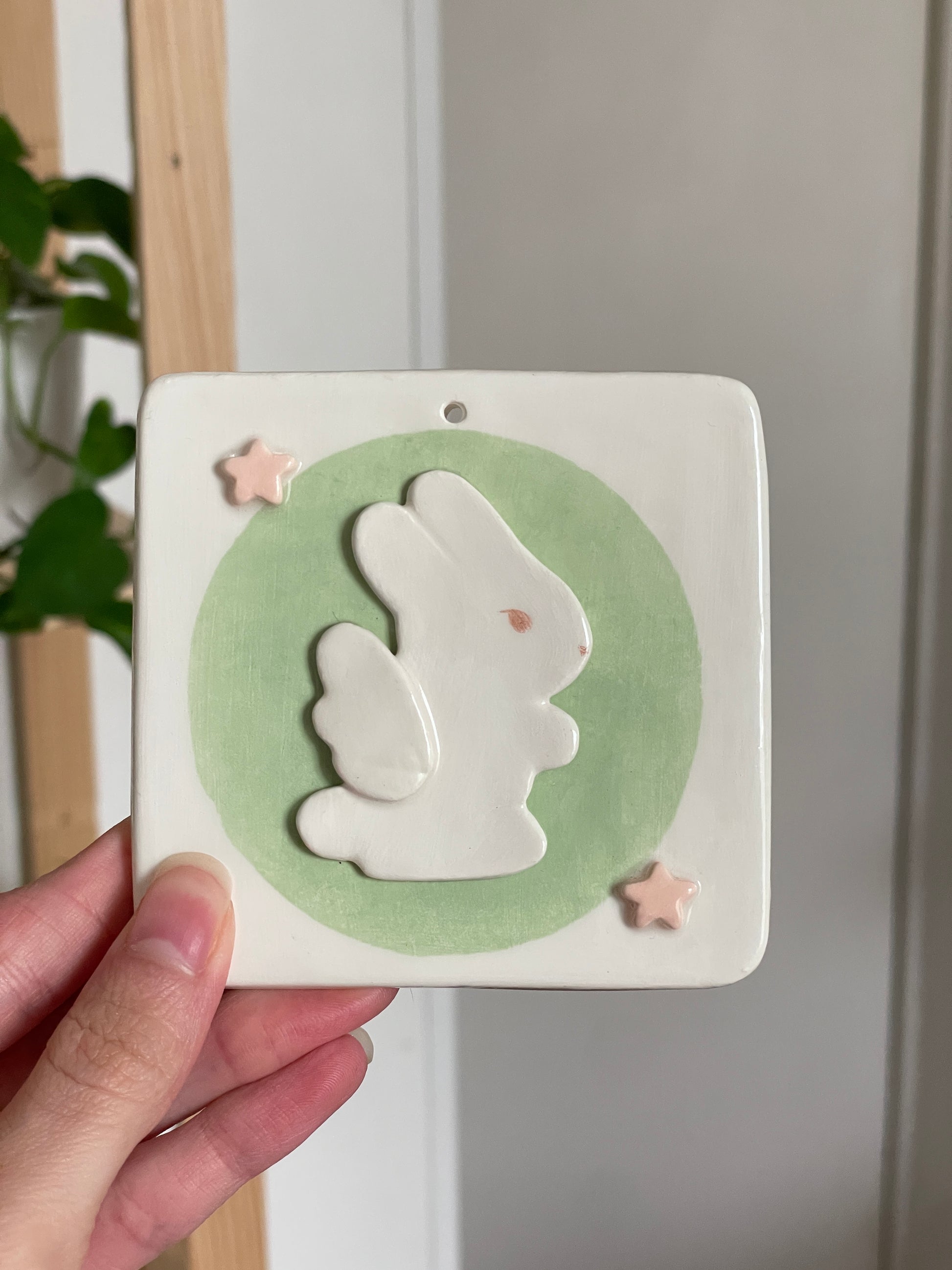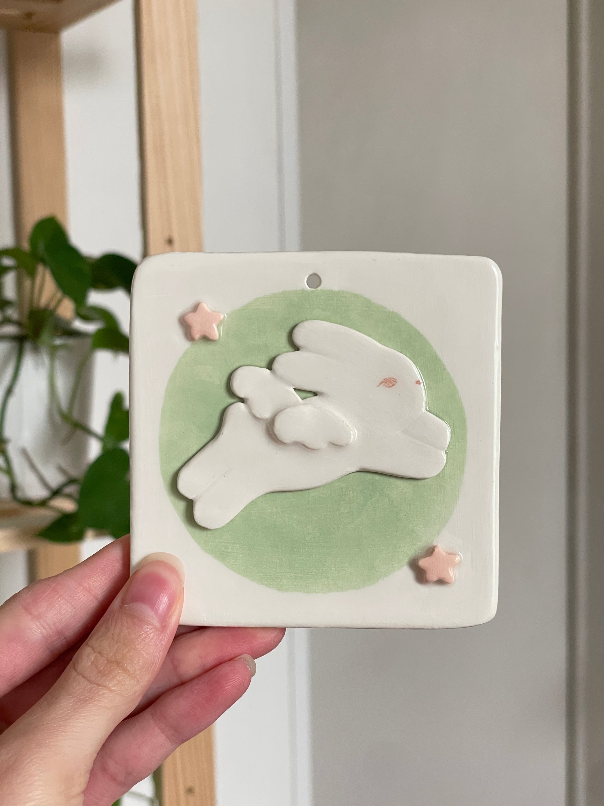 Ce lot de 4 tuiles en argile raconte une petite histoire douce : celle d’un lapin ailé qui se promène dans un univers poétique, entre herbes hautes, fleurs timides et souffle printanier 🐇🍀