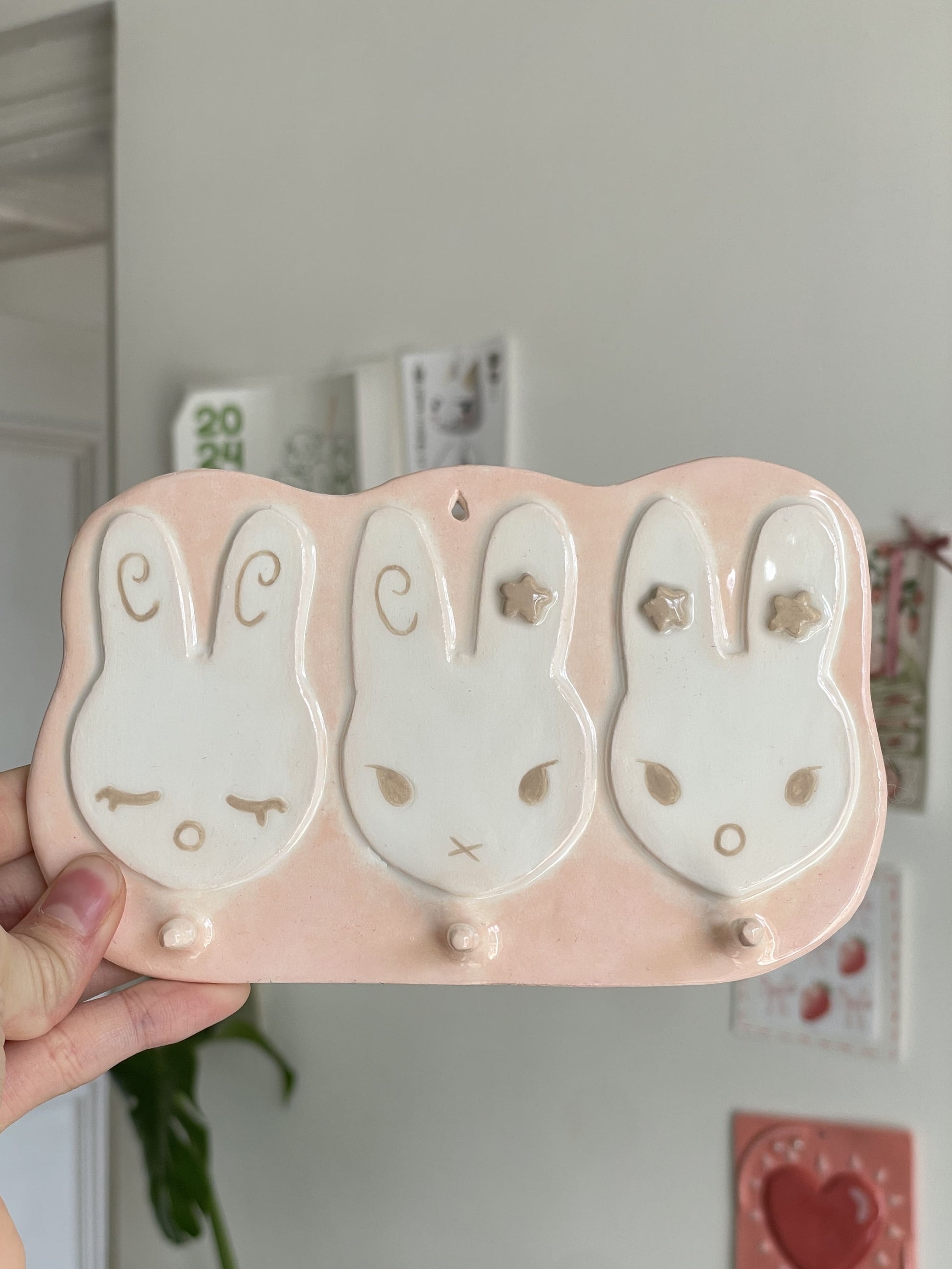 Ce petit portant mural met en scène trois adorables lapins ! Ils sauront garder un œil attentif et précieux sur vos clés ou vos bijoux préférés 🤭✨